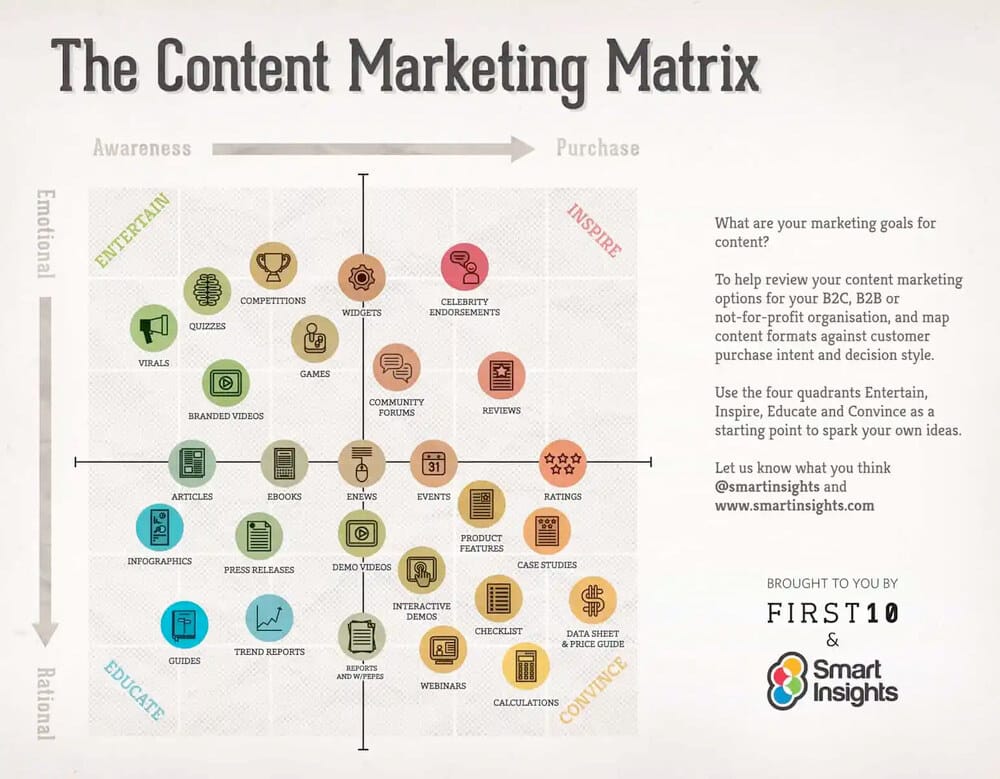 Hieronder vind je de content marketing matrix van Smartinsights.com dat een goed beeld geeft van verschillende soorten content en de functie/het effect daarvan in de funnel.