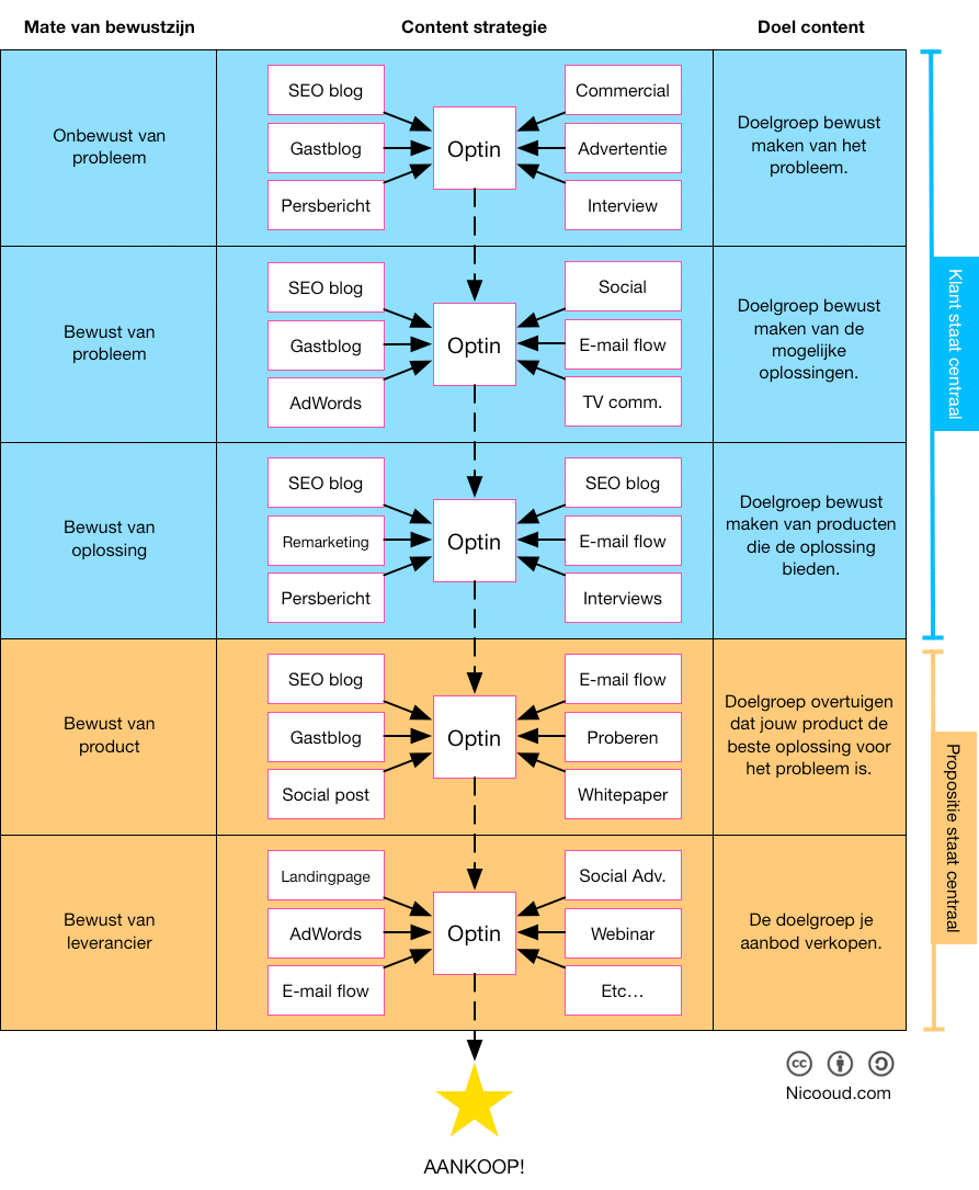 Contentmarketing doe je hoofdzakelijk in de marketing funnel, tenzij de awareness van de doelgroep hoger is dan level 4 (waar ik zo op terugkom).