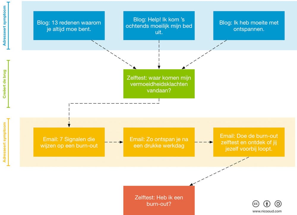 Om die optin heen produceer je dan verschillende soorten content die verwijzen naar de optin, in het bovenstaande voorbeeld de test.